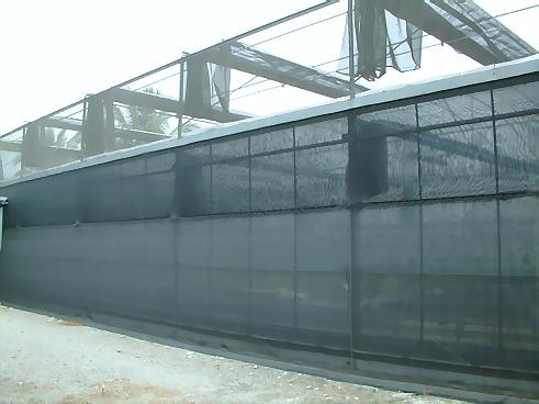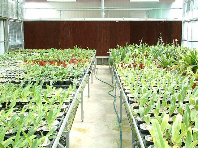 溫室1 為天然溫室 ( 非水牆 )。長約 24公尺,寬約 15公尺,面積約 105坪,屋頂是PC浪板,地面上鋪上碎石頭,花架高度離地約 75公分,四周圍的遮光網採用銀灰色的針織網以期望能在夏天降低些許溫度,下面的網邊離地 60公分來增加通風,屋頂上方有一層黑色的電動遮光網,溫室內也有一層銀色的電動遮光網,澆花則用地下水以細噴頭自動澆,三不五時也會自動將地板的碎石噴噴水來增加些溼度,其實與一般的天然溫室相較並無任何特殊之處。 |