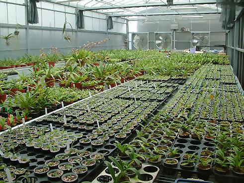 本園溫室位於高雄縣美濃鎮,是典型的鄉下地方。土地面積約335坪,周圍平坦無遮蔽物,除了百米外的雞舍、菇寮及養鱉池外幾乎全是稻田。 美濃地區的地下水石灰質含量很高,而我這塊地周圍亦無自來水管線,所以目前也只能將就的使用地下水,這是我在栽植上所面臨最頭痛的問題! 由於美濃地區屬於平地,所以夏天夜溫並不低 ( 24 ~ 25℃ ),白天炎熱 ( 33 ~ 35℃ )而且大都無風,所以天然溫室對於大部分的斑葉類拖鞋蘭來說是高了一些,試過一些品種之後本人宣告放棄,但是幾乎大部份的綠葉多花類拖鞋蘭在此天然溫室內的生長良好,再加上本人對於多花類拖鞋蘭情有獨鍾,所以全部都是栽植多花類拖鞋蘭。
