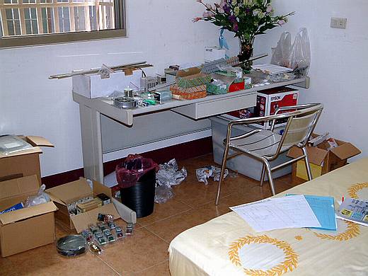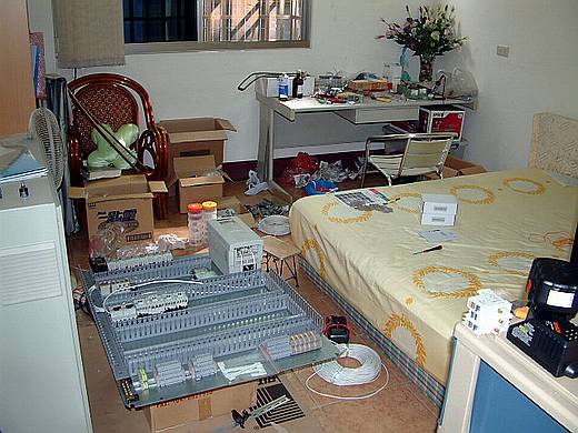 | 圖面畫的差不多以後就一邊開始向廠商訂購零件,或自己騎車或開車外出購買。 零件部品紛紛到貨,我家三樓的客房也堆的亂七八糟了。 這個房間香港的 avery 蘭友也曾經來住過。 |