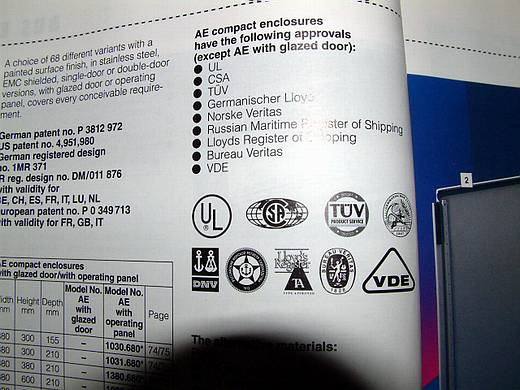 | RITTAL的 AE 系列,各位看看多麼誇張,光是一個機箱就通過這麼多種認證,這不是一般水電行牌的配電箱能比的。 | ![]() |