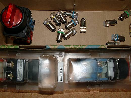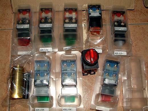 | 所有的選擇開關或按鈕開關全都採用 FUJI 的,質感很好,連安裝它的專用工具(左下角)都一起買了。 我自己那一箱只採用台製的,後來經常發生接觸不良,這次買這個日本富士的開關是台製的四倍價,下重本了。 |