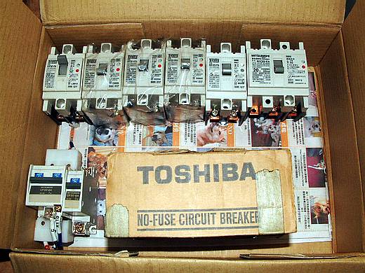 | 主電力無熔絲開關採用東芝。 分電力無熔絲開關與無熔絲漏電開關採用三菱的(上排)。 在溫室等高度潮濕的環境裡對於電力的處理要相當小心,所以我對於所有的分電迴路都有裝設漏電無熔絲開關,而我的分電迴路就等於是每一裝置就設置一個漏電無熔絲開關。 電子儀表用的無熔絲迴路開關採用三菱的 (左下角),這種的反應迅速,專門是用於電子類儀表用的。 |