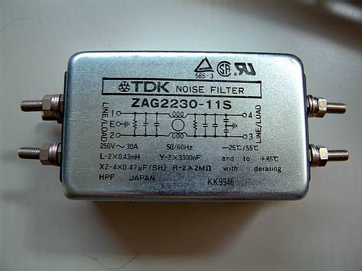 | 電源雜訊濾波器,會裝2個,一個給變頻器電力輸入用,另一個給控制迴路裡的電子類儀表用。 本來還想在控制迴路部份再裝一個電源用避雷器,但經費實在是已經透支了,所以只用這種電源雜訊濾波器。 |