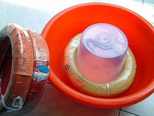 | 細電線很容易打結,但我又買不起專門的電線架,所以用個臉盆外加小水桶套裝著一捲電線,這樣子的道具可大大降低打結的機會。 否則若細電線打結以後,我告訴各位:花在拆線的時間會比配線的時間還要多,邊拆還會邊罵,拆到最後您一定寧願整捆丟掉再重新買。 |