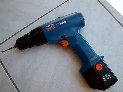 | 充電式電鑽,用來鑽孔,但對我最重要的是用來攻牙,先鑽出孔後再用攻牙頭攻出螺紋。 | ![]() |