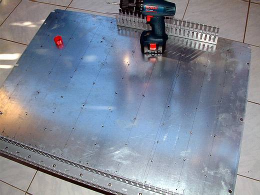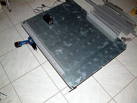 | 整個控制箱我將它分成底板、面板與箱體三個部份。 依照所畫的圖在底板上畫出線槽與鋁軌的基準線,畫好後裁切出線槽與鋁軌。 將線槽與鋁軌排列於底板上後畫出固定用螺絲孔的記號,依照螺絲孔記號鑽孔。 照片是底板剛鑽好孔的情況。看照片就知道我在趕夜工,在我家陽台加工,相片是用閃光燈拍的。 向朋友借的充電電鑽實在不怎麼好用,充一次電只能鑽10~15個孔,鑽到沒電時電池熱熱的充電器竟然拒絕充電,必須要等待電池冷卻後才能充電,天ㄚ!等待冷卻要超過1~2個小時。 後來我想到用塑膠袋把電池包起來丟到冰箱的冷凍庫冷卻,但是這樣也必須要等待 40分鐘。 並且其扭力也不足,能否應付接下來的攻牙步驟是我最擔心的。 今晚先做到這裡,重要的攻牙步驟明天白天有光線時再來做。 |