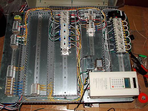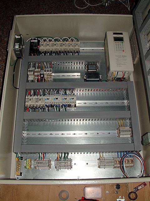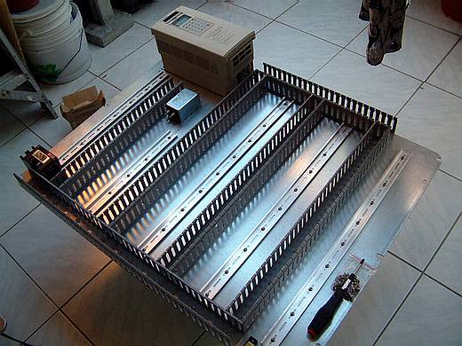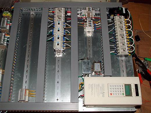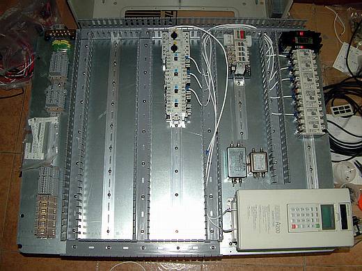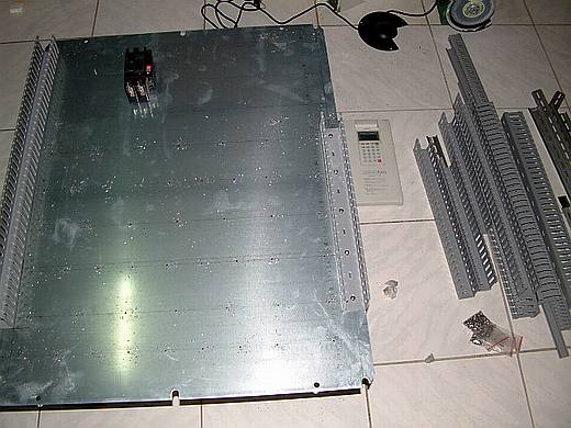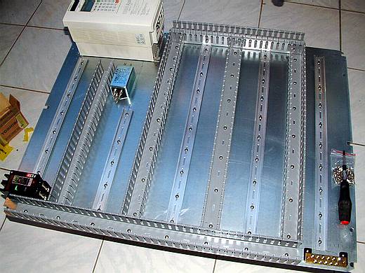 | 已經將線槽和鋁軌固定好了,並且總開關、變頻器、電源濾波器等非軌道型零件也一併固定。 終於!底板的五金加工幾乎已經完成,而天也快黑了! |