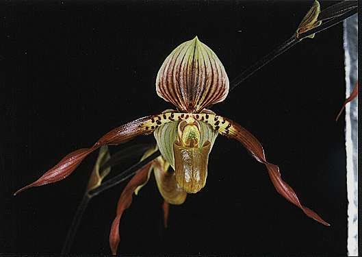 Paph. philippinense  x  lowii, 這個個體是由很多實生開花株中挑選出來的,這批花顏色差異小, 此個體花稍大且上萼瓣只有基部後翻, 個人特別喜歡此品種及其交配 Paph. rothschildianum 的後代 Paph. Jerry Spence