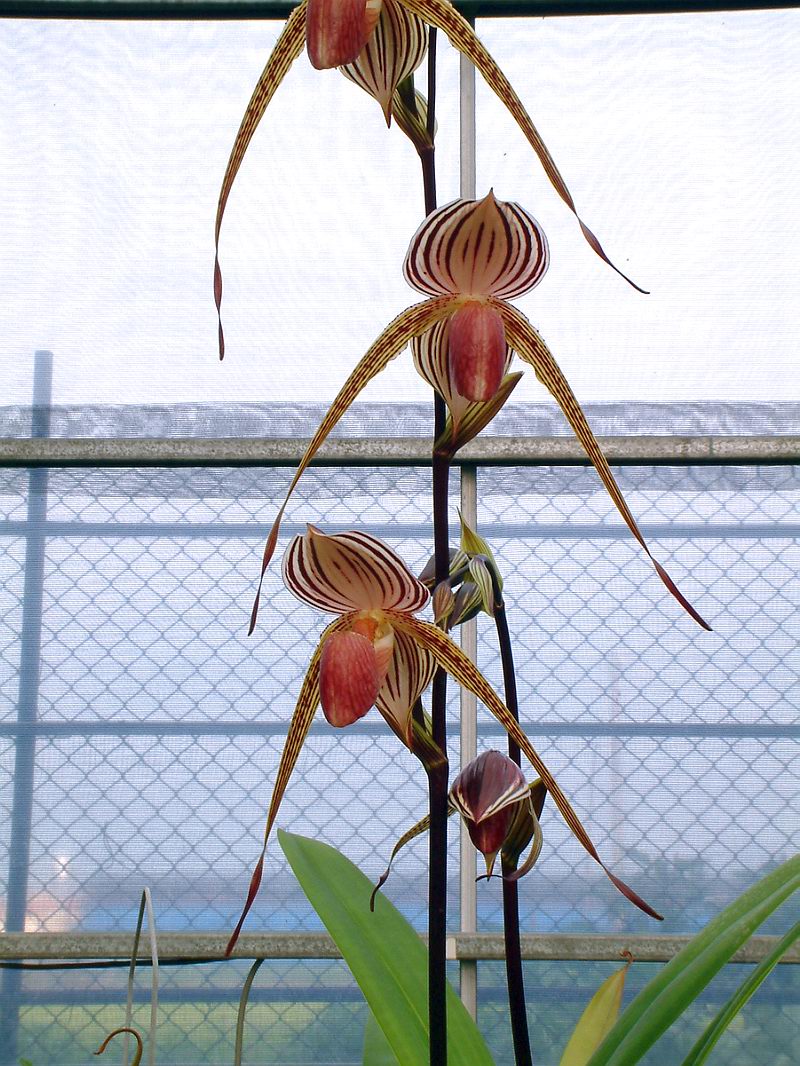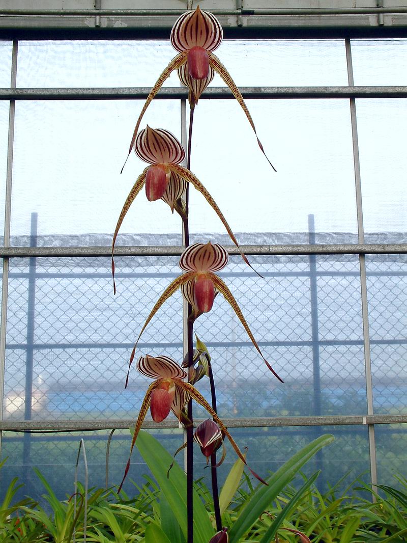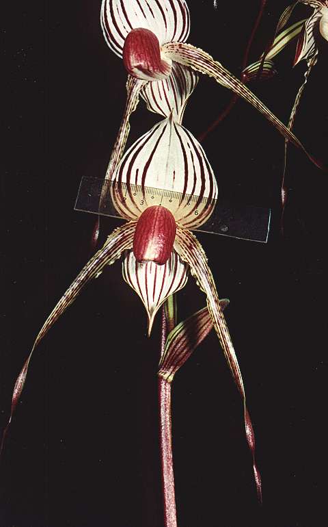 = Paph. rothschildianum  x  stonei,這是一株帶粉紅白底的個體,也是本人所知花朵最大個體,其上萼瓣剛好為 6.0cm。照片中特別架上一根尺給各位欣賞(注意: 從 1cm ~ 7cm),是我於 1997 年花季看花買的,當時上萼瓣為 5.1cm 我看它的開花芽很虛弱(只有兩片半的葉子),是以我判斷它應有 5.6cm 的實力,結果於 1998 年再次開花時為 5.5cm,今年 1999 即為上圖。我發覺其花苞在張開到定形的過程其上萼瓣向橫方向的擴張能力實在驚人。而且只要開花芽比上次的稍強壯些其花朵就會大很多,我再次預估其下次應會超過 6.2cm,而且其唇瓣為鮮豔的紅色,實在漂亮。聽說這批花是西德進口的實生株(我當初看花買了兩株,另一株為 'TC-2' ),開花後好花率為 4~5 成,有買到苗株的人大都笑顏逐開。(註 : 4/15 再次測量其上萼瓣已為 6.1cm )