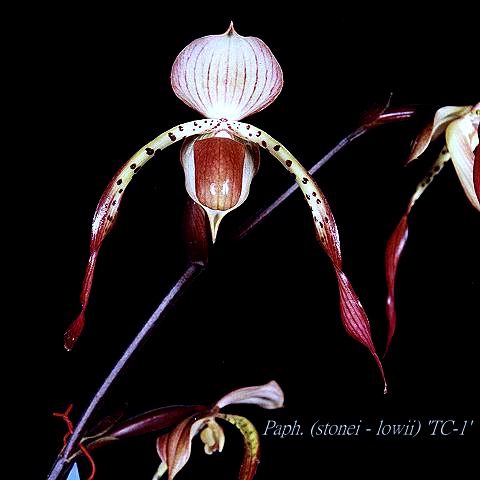 = Paph. stonei  x  lowii,非常漂亮的交配,花朵似 stonei,而花瓣顏色像 lowii,本個體上萼瓣較平整不後翻,而且花朵比一般的stonei 還大,花梗超長,花距大,一梗開七朵花。本人期待其後代的發展