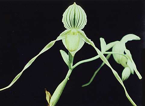 山採原種花的突變綠化株,這個個體是我們台灣的 Paph. philippinense alba 中很有名的個體,由上圖可看出其上下萼瓣的圓整,花瓣的角度充滿力與美。就算是正常的個體要挑這種花型的都已很難了,更何況是突變種。