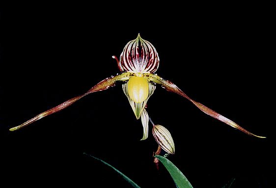 山採原種,為 Paph. philippinense 的一個變種,此個體植株很小,葉子的質地從葉基到葉尖皆又硬又厚如同蘆薈葉般多肉,花朵帶蠟質且質地亦很厚,上萼瓣線條粗又多又分叉,靠近 上、下萼瓣尖端都有一搓鮮綠色的細線條,左右花瓣挺的很漂亮,它將是我未來育種上在 philippinense 系列中最想使用的個體。