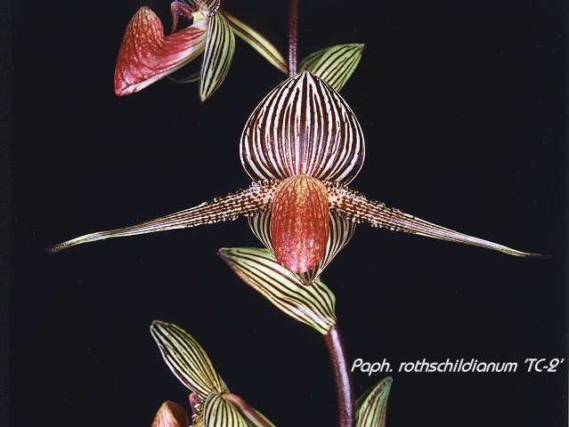 原種花,這是我由山採株中挑選出來的個體。花朵質地厚,上下萼瓣極圓整,底色為粉紅白,線條粗,為深褐色,左右花瓣大部分的花朵為水平伸展(比相片中更水平),植株葉子特寬, 其交配之後代植株狀態亦相同,這是本人最愛使用來育種的 roth 個體。