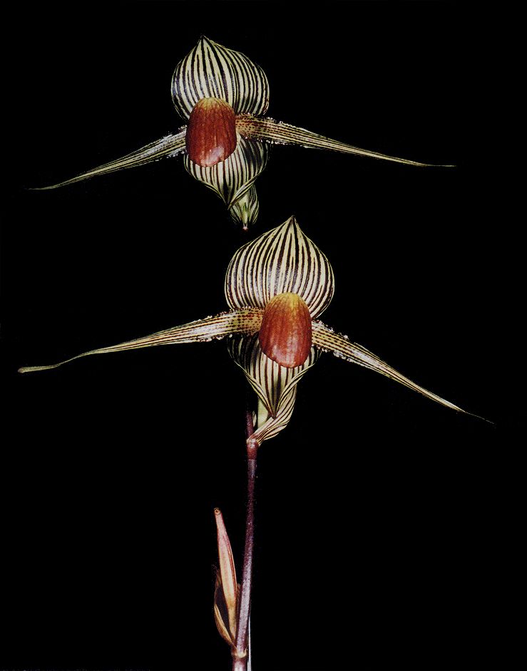 原種花,為美國 The Orchid Zone 蘭園所育種,編號為 Z2135,其親本為 Paph. rothschildianum 'Rex' x 'Mont Millais'。2000 年開頭次花,一梗 3朵,一開花芽帶兩支八分大的芽,因為原花主參加台南新豐的比賽( Z2135 花朵質地較薄,較不耐乾燥的比賽環境 ),再加上轉了 2 手,是以我們買到時(第 3 手)其第一朵花已經凋謝了,而第二朵也差不多了(看其上、下萼瓣尖端與第三朵的差異就知道),上面的花朵數據為第 2 朵花,其花朵顏色深,唇瓣大且紅度夠,花瓣粗而角度高挺,花梗長(與我開 4朵的 'TC-RM-1' 花梗總長度一樣),除了其花朵夠大之外我最重視的一點為其花型與 Paph. rothschildianum 'Mont Millais' 非常非常相似,依此批的開花性推斷本株應該還有不小的潛力,預估其開 4朵花時上萼瓣應可超過 6.5 cm。